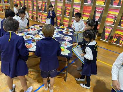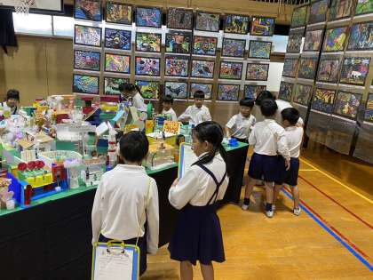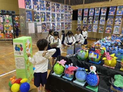 自分たちの作品が格好良く飾られていることに誇らしさを感じているようでした。またお兄さん、お姉さんの素敵な作品をたくさん見つけて「すごい!」「見て見て!」と楽しそうに鑑賞しています。