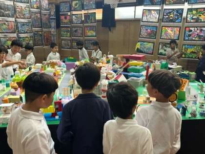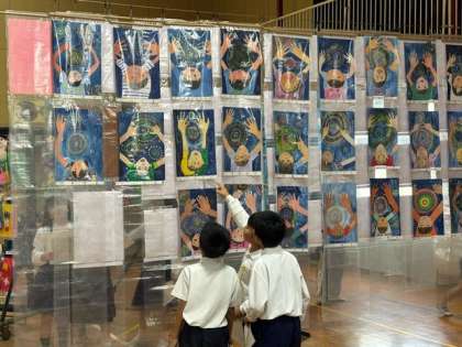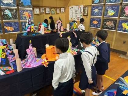 他の学年の作品を見てにっこり笑顔の3年生。お気に入りの作品を見つけることができたかな?