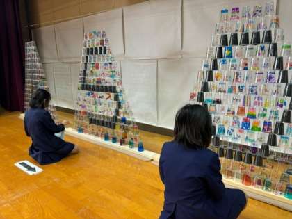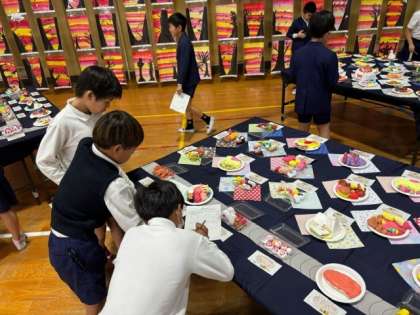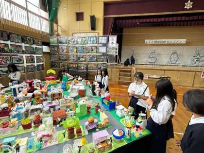 5年生の鑑賞会の様子です。全児童による共同作品モニュメントのどこかに自分が制作したものが含まれています。どこにあるのか見つけるのは簡単ではないですが、じっくり探しています。