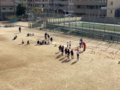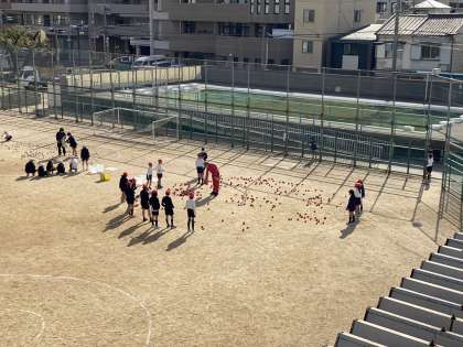 今年度は学校全体で「投」の力を育む取り組みを進めています。1学期の「なかまで目指せ!ぴったり150m」の取組みは記憶に新しいと思います。遠くからの写真で何をやっているのかよく分かりませんが、玉入れです。