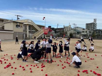 他学年が玉入れ週間で活動しているのを見ていて、自分たちの番はいつ来るのか楽しみにしていました。合図とともに全力投球。