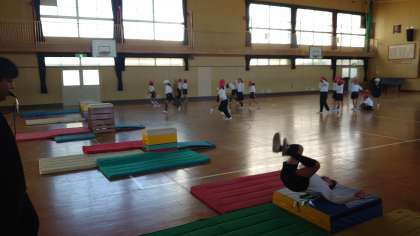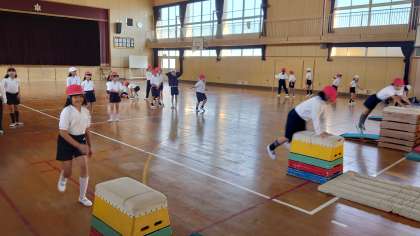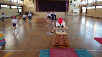 それぞれのレベルに合わせた場所で、順番を守って次々と跳んでいきます。跳び箱を跳び越えた時の笑顔がとても嬉しそうでした。
