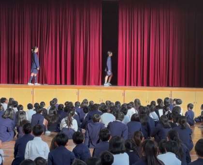 今回は、「何が通ったでしょう?」クイズです。体育館の舞台幕を少し開けている状態にし、その間を何かが通ります。ゆっくり通ると何が通ったのかよく分かるのですが、物が飛んでいくように一瞬に通り過ぎると、みんなの頭に?が浮かび、子ども達は一気にざわめきます。