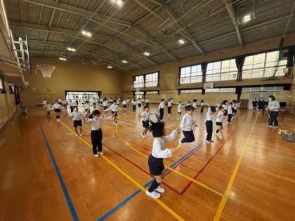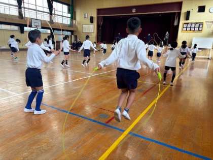 音楽に合わせて、リズムよく跳べるように頑張っています。今日は雨の影響で体育館での実施でしたが、明日からは運動場で実施できると思います。