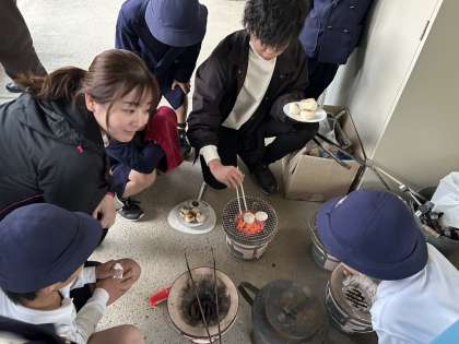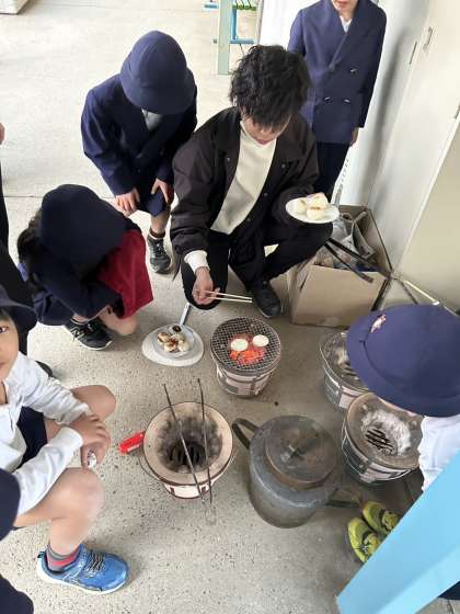 無事に火おこしに成功し、お餅を焼いていると、いきいき活動に参加している子ども達がナイスタイミングで通りかかり、「先生だけ、ずるい!!」と言われていました。