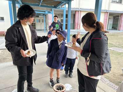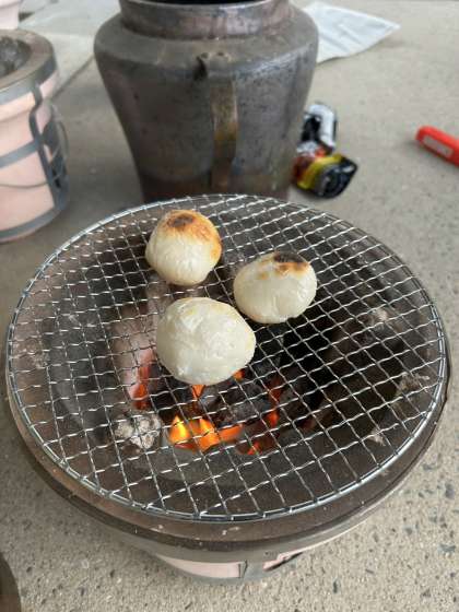 3年生担任が七輪で焼いたお餅は、卒業遠足の引率から帰って来た6年生の先生たちに食べてもらったとさ。めでたしめでたし。