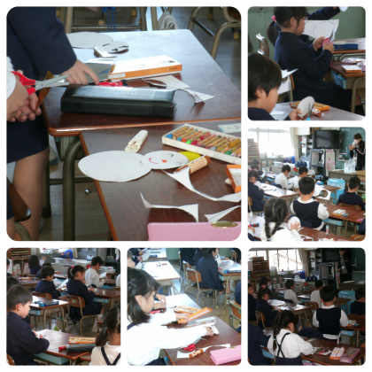 1月13日(水)、1年生の図工の学習の様子です。紙を丸く切り、クレヨンで顔を描いてしました。