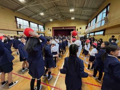 縦割り班に分かれ、ボール運びレースを楽しみました。