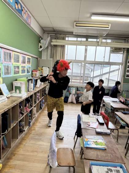 3日(月)、1年2組に鬼が出現。でも、子ども達は楽しそう。