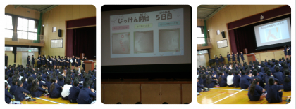 その後、保健委員会から発表がありました。2学期にパンを使って、手の汚れと洗剤による手洗いの大切さを実証したものでした。