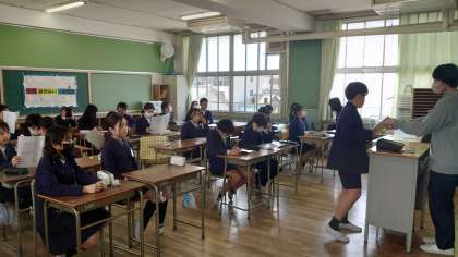 下段:5年2組、修了式の日と言えば、通知表!まさに一人ひとり通知表を担任の先生から受け取っているところでした。
