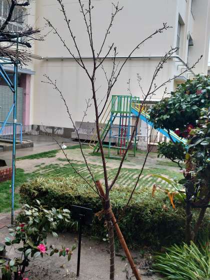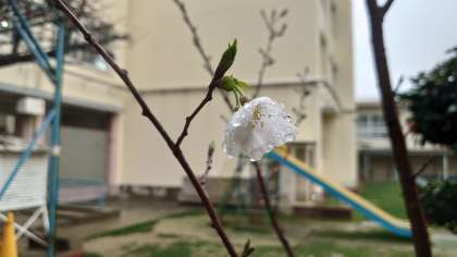 創立150周年の記念で植樹した桜の木に一輪の花が咲いていました。