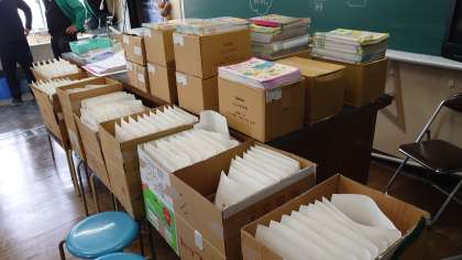 4日(金)午後は教職員総出で入学式の配布物を袋詰めしました。
