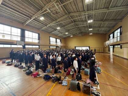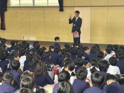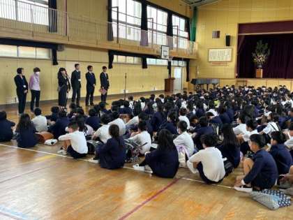 校歌を歌った後、新しい校長先生のお話、新しく着任された先生の紹介。みんな興味津々です。
