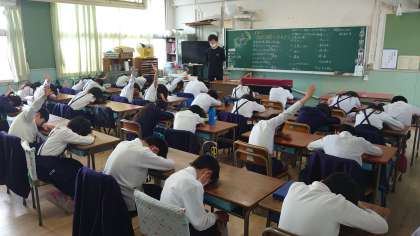 みんな約束を守って、机に突っ伏せている中、先生は楽しそうです。