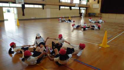 春らしい温かい空気に包まれ、5年2組さんが気持ち良さそうに体育の学習に取り組んでいます。グループで息を合わせながら立ったり座ったりしました。全員が心を合わせないと意外と難しいのですが、どのグループも協力して上手に動きを揃えていました。