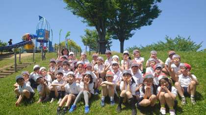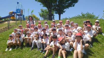 芝生の丘で学級写真を撮りました。