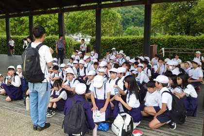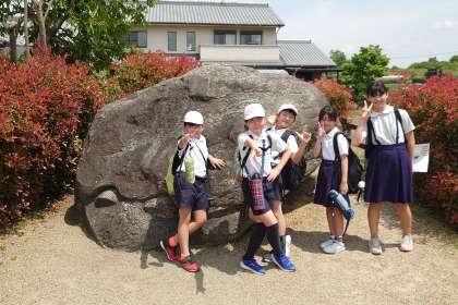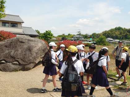 ちょうど中間地点くらいの明日香村川原にある石造物「亀石」を他校の友達とも一緒に見学しました。歴史を学習する6年生は、飛鳥に来ることが多いのでしょうね。