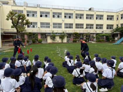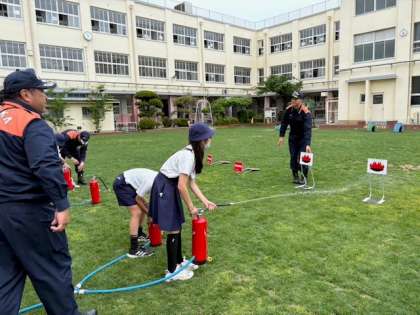 消防署に協力を頂きながら実施する防災訓練は毎年1回行っていますが、水消火器訓練は昨年度も実施した4年生なので、動きがとてもすばやくスムーズに実施することができていました。