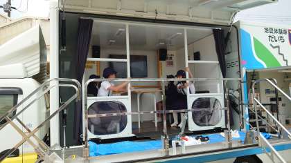 過去に実際に起きた地震をコンピューターで再現し、起震車でその時の揺れを体験できます。柱や身近なものにつかまっていないと振り落とされそうになります。