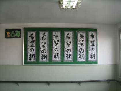 校舎を歩いていると、6年生の教室から「いま別れのとき、飛び立とう未来信じて・・・」と歌声が聞こえてきました。卒業式まで、1カ月以上ありますが、少し胸がキュンとなり、しばらく聞いていました。掲示板には「希望の朝」の書初め。