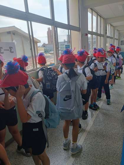 見てください!学年ごとに万博遠足に向けて気合を入れました。会場は大勢の来館者がいると思いますが、写真上段は3年生!南百の目印がかわいいです。