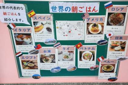 職員室前の掲示板には、現在、代表的な世界の朝ごはんを紹介しています。