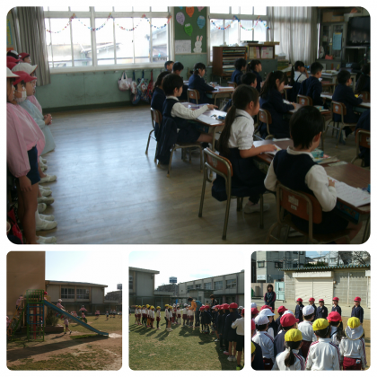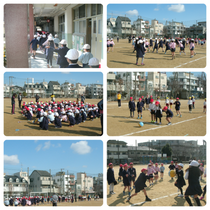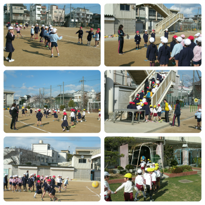 来校した園児たちは、最初に中運動場に集合し、1年生の教室へ上がって授業風景を見学しました。続いて、東運動場へ移動し、1年生とドッチボールをしました。天気も良かったので、園児たちも1年生の児童も笑顔で一杯でした!!