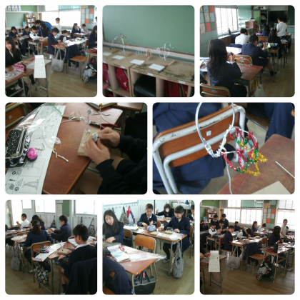針金を使って、動物や建物、スポーツしている人物などのモニュメントを作っていました。子どもたちは、針金を折ったり、丸めたり、つないだりしながら自分がイメージする何かを作っていきます。色のついた飾りをつけたり工夫しながら、夢中になって制作に打ち込んでいました!!