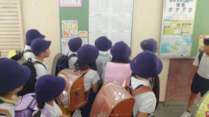 遠投大会の結果を職員室の前に掲示すると、登校して来た児童は興味津々で見ていました。
