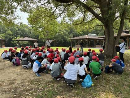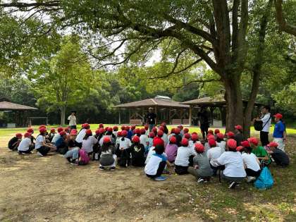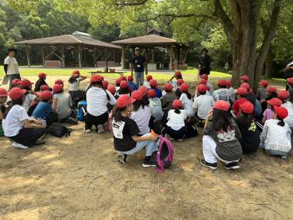 野外活動センターのキャンプ場に到着し、施設の方から施設の使い方について説明を受けました。
