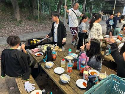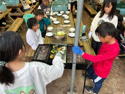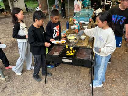 「野菜も食べや〜。」という先生の声を聞きながら、目線は肉へ一点集中。