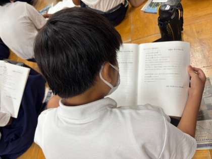 原子爆弾投下前後の広島の町の様子をDVDで観た後、被爆者が書いた詩を朗読していただきました。子どもたちも被爆者の詩を朗読しました。