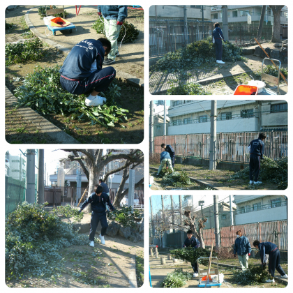 今日は、冷たい北風の中、東運動場で、管理作業員さんが伐採してくれた桜などの木々の枝を集める作業をしてくれていました。