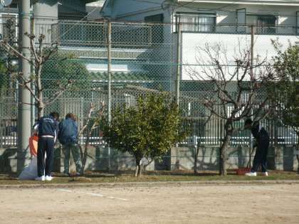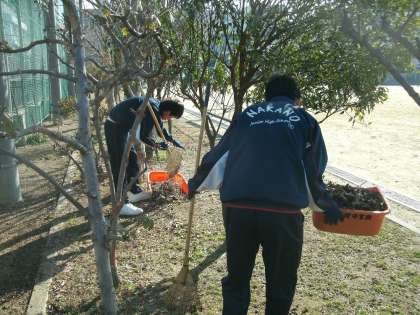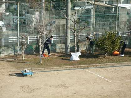 昨日に引き続き、東運動場の整備をしてくれています。落ち葉を集め、雑草を抜き、整地してくれるそうです。