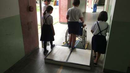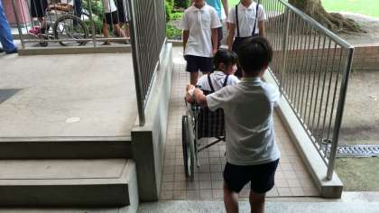 大阪市立心身障がい者リハビリテーションの方々をゲストティーチャーに招き、4年生が車いすを体験しました。