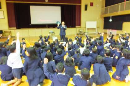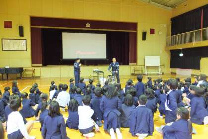 最初に、東住吉警察署のお巡りさんから、信号のわたり方・自転車の整備の仕方のお話を聞きました。ユーモアを交えて質問をされ、みんな楽しく答えていました。そのあと、自転車の乗り方のDVDを見て、ラビット隊の方から話を聞きました。