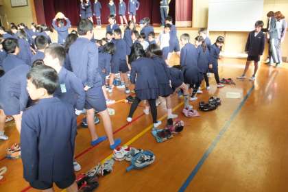 児童は体育館に縦割り登校班で集合し、班対抗ボール送りゲームをしました。
