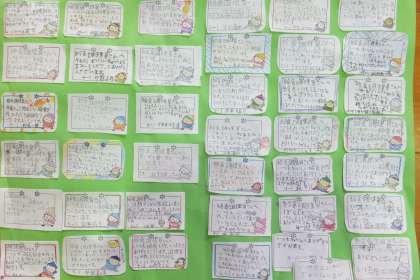 給食委員が司会をし、代表がお礼の言葉をのべました。調理員さんからもお話をしていただき、給食週間に学級で作ったメッセージカードをプレゼントしました。