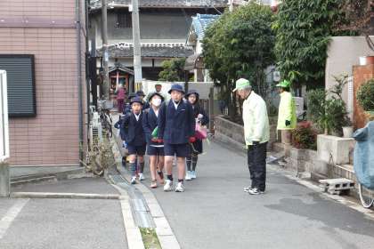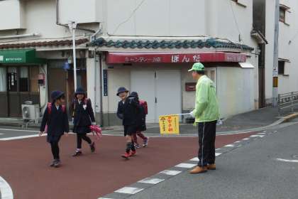 通学路の横断歩道や交差点など危険な箇所には、毎日の登下校時、地域の「まもるんジャー」の方が安全指導をしてくださっています。