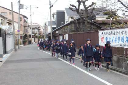本校では、集団登校を実施しています。子どもたちは、14の登校班に分かれ、家の近くの集合場所に集まり、6年生の班長さんを先頭に登校します。集合時間は、学校からの距離によって違いますが、8時10分の開門に合わせ決められています。