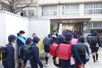 朝8時に集合した児童会や代表委員会の児童がたすきをかけ、のぼりを持ってみんなの登校を迎えます。