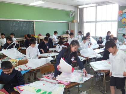 1〜5年生は、修了式を来週の月曜日にひかえ、1年間、頑張って作った作品の整理やお楽しみ会の準備をする学級もありました。