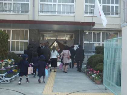 保護者の方に付き添われ、新入生は期待と希望で胸をふくませ、南百済小学校の校門をくぐりました。