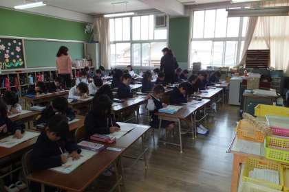 子どもたちは、教科書を開いてしっかり見ていました。また、線の引き方を習っていました。