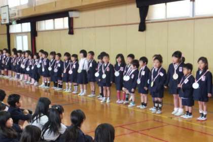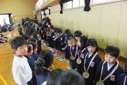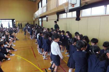 続いて、2年生からの贈り物、ペンダントの贈呈がありました。ペンダントを首にかけってもらった1年生はとてもうれしそうでした。