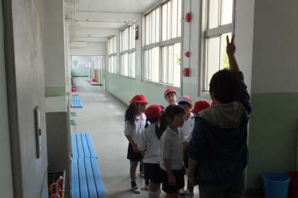 今日は、廊下で整列する練習です。班ごとに廊下で、先生の指の合図で1列になったり、2列になったり練習をしました。