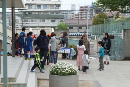 各団体が朝の早くから準備を進め、クラブチームの子どもたちも手伝っています。