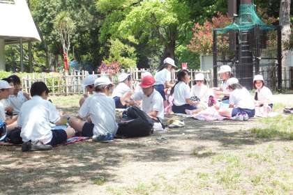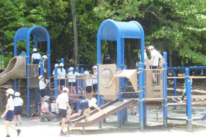 ポイントを回って、集合場所に戻った班から、遊具で少し遊びました。初夏の陽射しで少し動くだけで汗が出てきます。