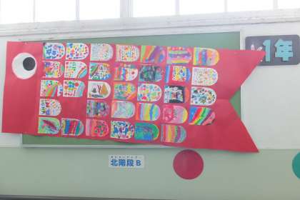 1年生の掲示板では、各学級で作った大きな鯉のぼりが泳いでいます。